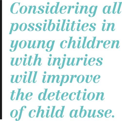 There are rare circumstances in which the injury alone is enough to suspect or diagnose abuse. If a young child presents with an obvious, devastating injury for which there is no explanation, or a nonmobile infant presents with unexplained bruising, abuse should be strongly considered. The challenge is that practitioners need to consider child abuse-as well as other nonabusive causes-on a more consistent basis. Being aware of bias tendencies and the need to consider all possibilities in young children with injuries will improve the detection of child abuse, as well as less common mimics of trauma.