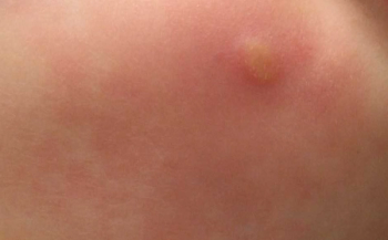 A healthy 14-year old boy was evaluated for an intensely pruritic shin rash that developed 2 weeks prior and had been treated with oral antibiotics for 10 days.