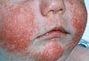 A 7-month-old boy with a history of severe atopic dermatitis and asthma was brought for evaluation of a generalized rash, fever, and irritability of 2 days’ duration. He had no respiratory symptoms. His medical history was significant for anorexia, without vomiting or diarrhea. He had a strong family history of allergy.