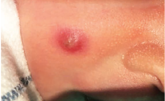 A healthy 11-day-old male infant is brought to the pediatric clinic for evaluation of rash. The rash started with a 2-mm papule on the left medial epicanthal fold 4 days before the clinic visit. A day before coming to the clinic, the rash had spread to the upper left eyelid and the nasal bridge. What's the diagnosis?