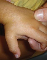 This baby boy was born at term to an 18-year-old primigravida via spontaneous vaginal delivery. The membranes ruptured about 6 hours before delivery. The amniotic fluid was heavily stained with meconium. Forceps were not used during the delivery. The newborn initially had poor tone and no spontaneous respirations, but his heart rate exceeded 100 beats per minute. Bulb and deep suctioning as well as supplemental oxygen were provided. Apgar scores were 3 and 8 at 1 and 5 minutes.