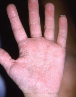 A scaly, erysipeloid rash had erupted in the axillae of an 8-year-old boy and spread to the buttocks and thighs within 2 days. The child complained only of pruritus. The rash had worsened despite treatment with clindamycin for 4 days.