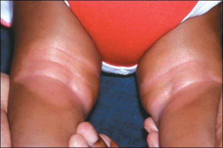 The areas of hypopigmentation on this 4-month-old girl are sequelae of eczema. The rash had developed on the infant's upper extremities in the bilateral antecubital and popliteal fossae at 1 month of age. Her cheeks were also affected, although only slightly. Her initial diet consisted of regular infant formula. This was switched to soy formula, which she vomited. She was then given a lactose-free formula, which she tolerated well.