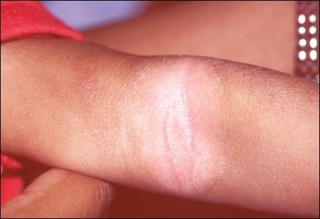 In this infant, the hypopigmented areas corresponded exactly to the sites affected by eczema. This made other causes of hypopigmentation, such as impetigo, unlikely. Postinflammatory hypopigmentation after an episode of eczema is unusual; it may be more common, or more noticeable, in persons with racially pigmented skin. In this case, the location of the eczema in the flexors and its duration may have been contributing factors.