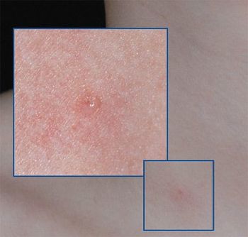 One week earlier, a 14-month-old girl with a history of eczema was evaluated because of a diffuse rash of excoriated lesions, some of them purulent. She was afebrile. Worsening eczema with secondary infection was diagnosed. Treatment with oral clindamycin was prescribed. At follow-up, the lesions had worsened. The child had multiple excoriated papules, some of which had coalesced into plaques. She also had two 5-mm vesicles on her right shoulder. Eczema herpeticum was diagnosed clinically. Culture of the vesicles later grew herpes simplex virus (HSV).
