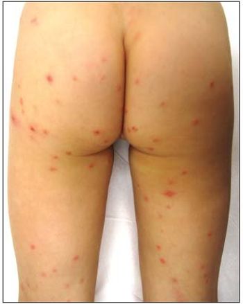 A 5-year-old girl presented with a 2-day history of a widespread pruritic rash that began while the family was on vacation. The rash appeared suddenly as small pink macules and progressed to papules and pustules. Her brother had a similar-appearing but milder rash. She denied fever, chills, or constitutional symptoms. On further questioning, her father reported that she and her brother had been in a hot tub at their vacation home.