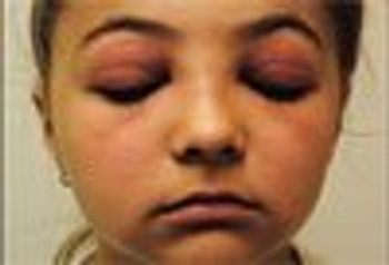 This 8-year-old girl has had swollen, red eyelids for the past 24 hours. She denies pain or pruritus. She has had no eye drainage, fever, or other systemic signs of illness. She reports some mild fatigue for the past few months but denies myalgias or decreased muscle strength.