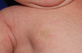 The mother of a 5-week-old boy was concerned about a swelling under her infant’s right nipple. A 2-cm, movable subareolar mass was palpated on examination.