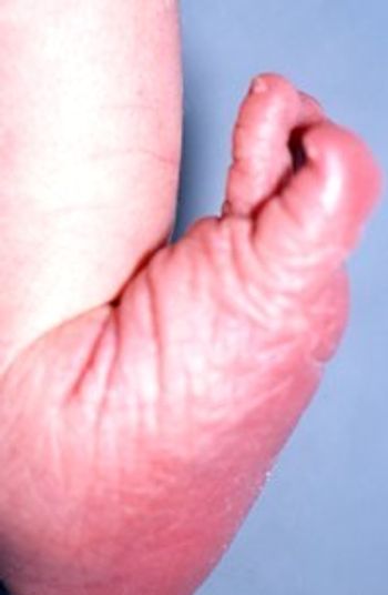 A newborn girl was noted to have talipes calcaneovalgus, excessive dorsiflexion of the foot that allows its dorsum to come into contact with the anterior aspect of the lower leg- the toes point upward, the arch is flat. The right foot was normal. The infant had no other abnormalities.