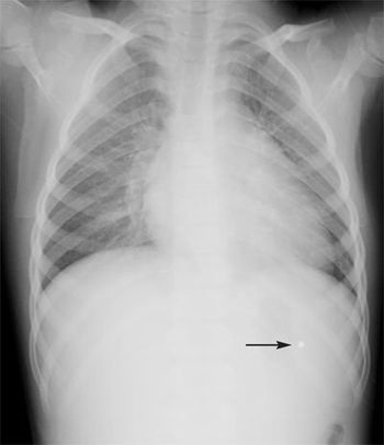 A 5-year-old girl was brought to the emergency department after she was injured during a drive-by shooting. She had 5 small entry wounds: 2 in the arm, 2 in the buttocks, and 1 in the left torso. Radiographs confirmed that a piece of pellet had entered her upper torso but was not in the lung or causing any problem.