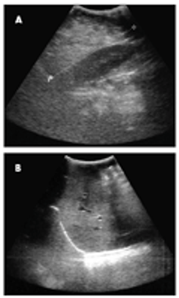 A 6-month-old boy was hospitalized because of fever and suspected central line sepsis. He had been receiving total parenteral nutrition (TPN) since shortly after birth following a small-bowel resection, which was performed to repair a midgut volvulus. Abdominal ultrasonographic findings after the procedure were normal. The infant was born at term after an uneventful pregnancy and delivery. Alkaline phosphatase and γ-glutamyl transpeptidase levels were elevated, without hyperbilirubinemia. An ultrasonogram showed hyperhomogeneous and nonhomogeneous echogenicities of the liver, consistent with fatty changes and fibrosis.
