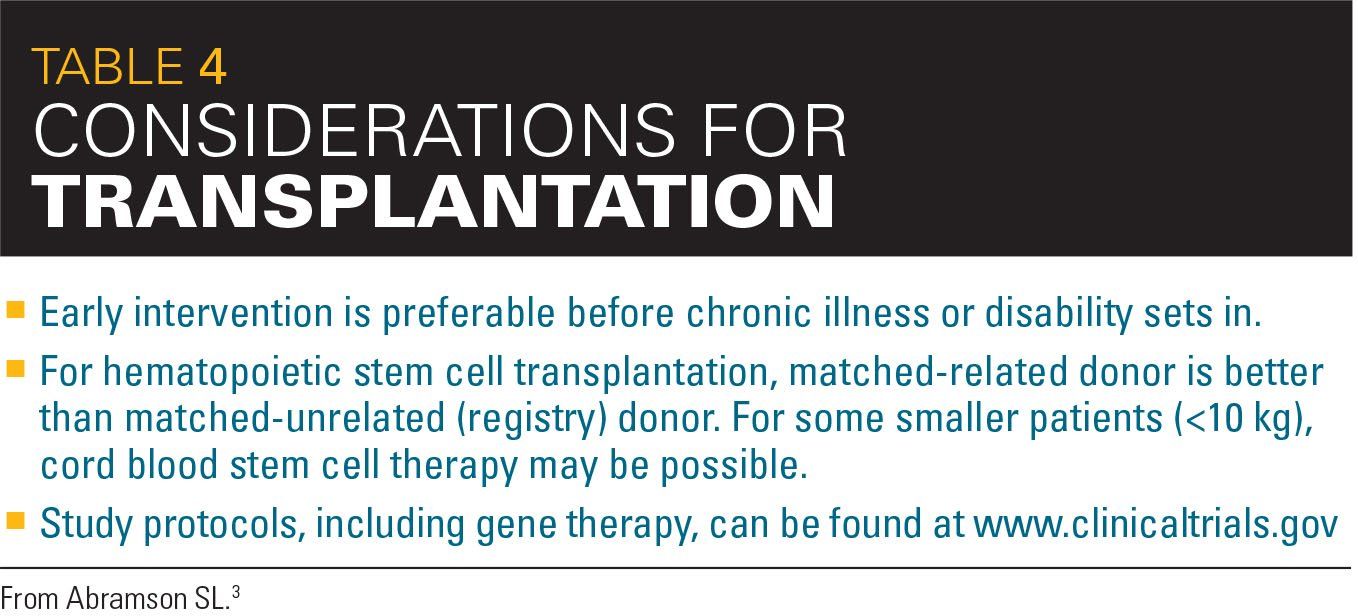 In addition, Abramson said that early detection is critical for children who have a severe PI because they can be candidates for bone marrow transplantation. These children typically have an immunodeficiency that poses serious, life-threatening outcomes if immune reconstitution is not achieved. “If you wait too long and the infection becomes too difficult to treat or becomes chronic, it’s much riskier to do a bone marrow transplant because you have to immunosuppress the patient as you don’t want them to develop a graft-versus-host reaction,” he said. Characteristics for transplantation for PI disorder are listed in Table 4.