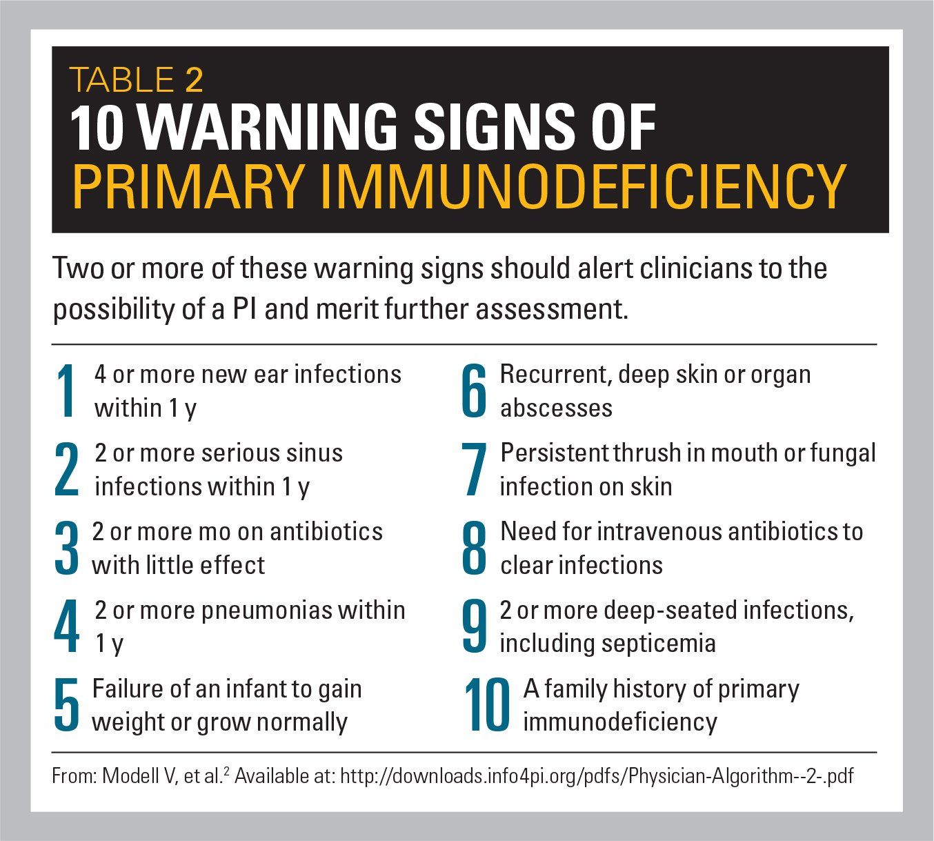 2. Modell V, Gee B, Lewis DB et al. Global study of primary immunodeficiency diseases (PI)-diagnosis, treatment, and economic impact: an updated report from the Jeffrey Modell Foundation. Immunol Res. 2011;51(1):61-70.