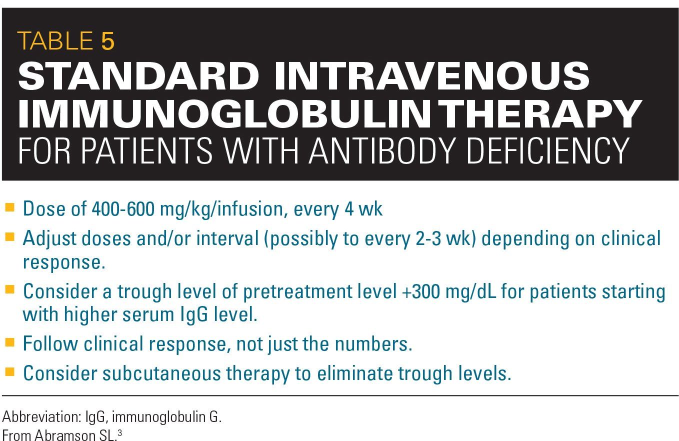 Currently, most children diagnosed with PI disorders are treated with immunoglobulin therapies that can be delivered either intravenously in the clinic or subcutaneously at home.4 Table 5 describes a standard intravenous immunoglobulin therapy. For some children, subcutaneous therapy at home may be a better option. When compared with intravenous therapy, the benefits of subcutaneous therapy include improved quality of life, lower costs, and lower systemic adverse effects. However, disadvantages may include the need for more frequent treatments and local reactions at infusion sites.