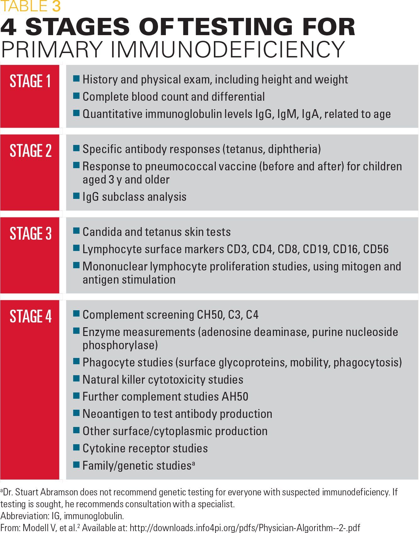 Diagnosis of a PI disorder is based on stepwise approach involving 4 stages. Table 3 lists the stepwise approach to diagnosis recommended by the Jeffrey Modell Centers Network. Abramson said that most PIs (about 75%) can be diagnosed by obtaining a complete blood count (CBC) and quantitative immunoglobulin levels (stage 1).