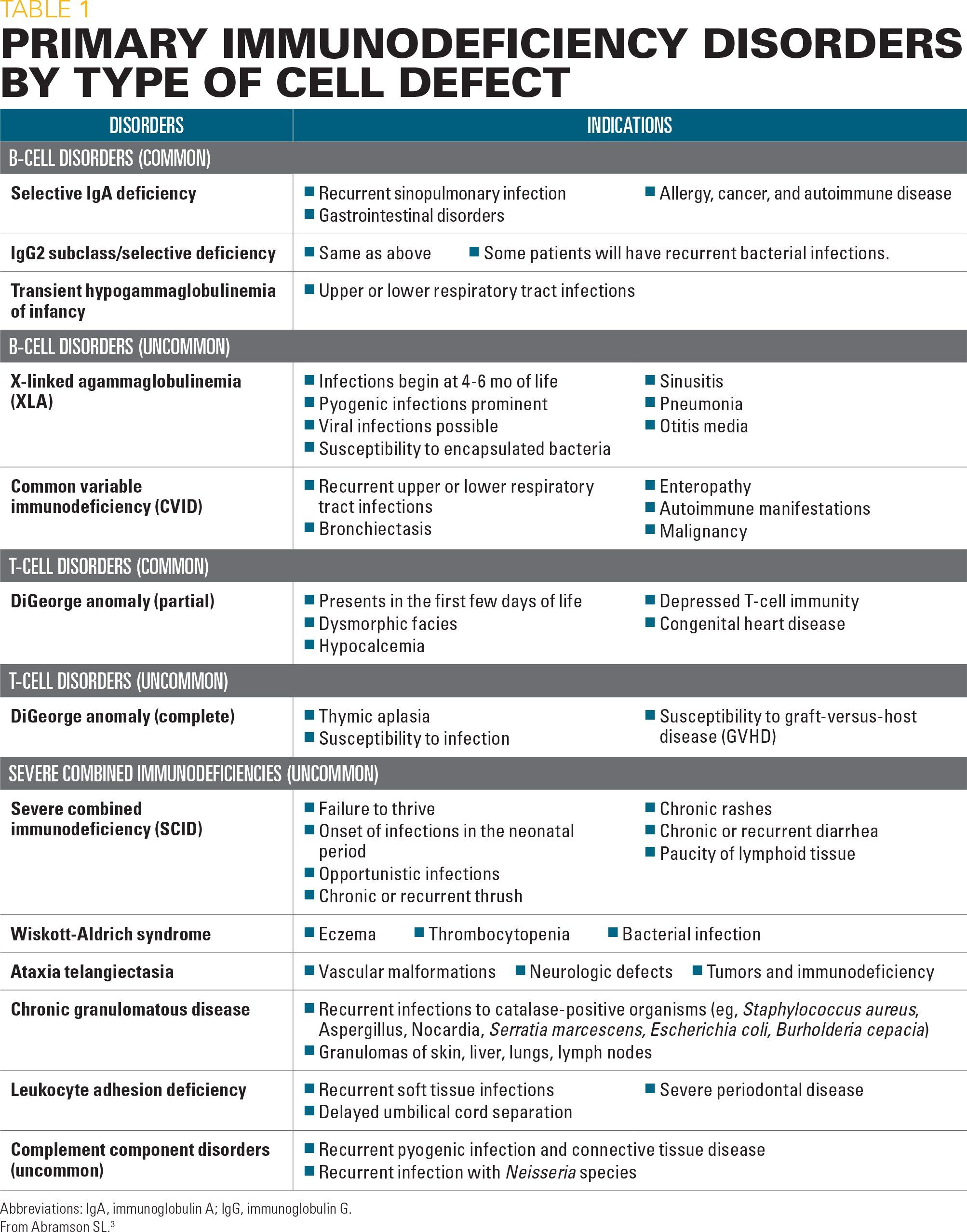 Fifty percent of PIs are primary B-cell disorders: both more-common PIs (eg, selective immunoglobulin A [IgA] deficiency disorders) and uncommon PIs (eg, X-linked agammaglobulinemia). Other types of PIs are categorized as combined B-cell and T-cell immunodeficiencies (20%), phagocyte immunodeficiencies (18%), T-cell immunodeficiencies (10%), and complement immunodeficiencies (2%).1 Abramson provided a brief description of several common and uncommon PIs and their clinical presentations (Table 1).