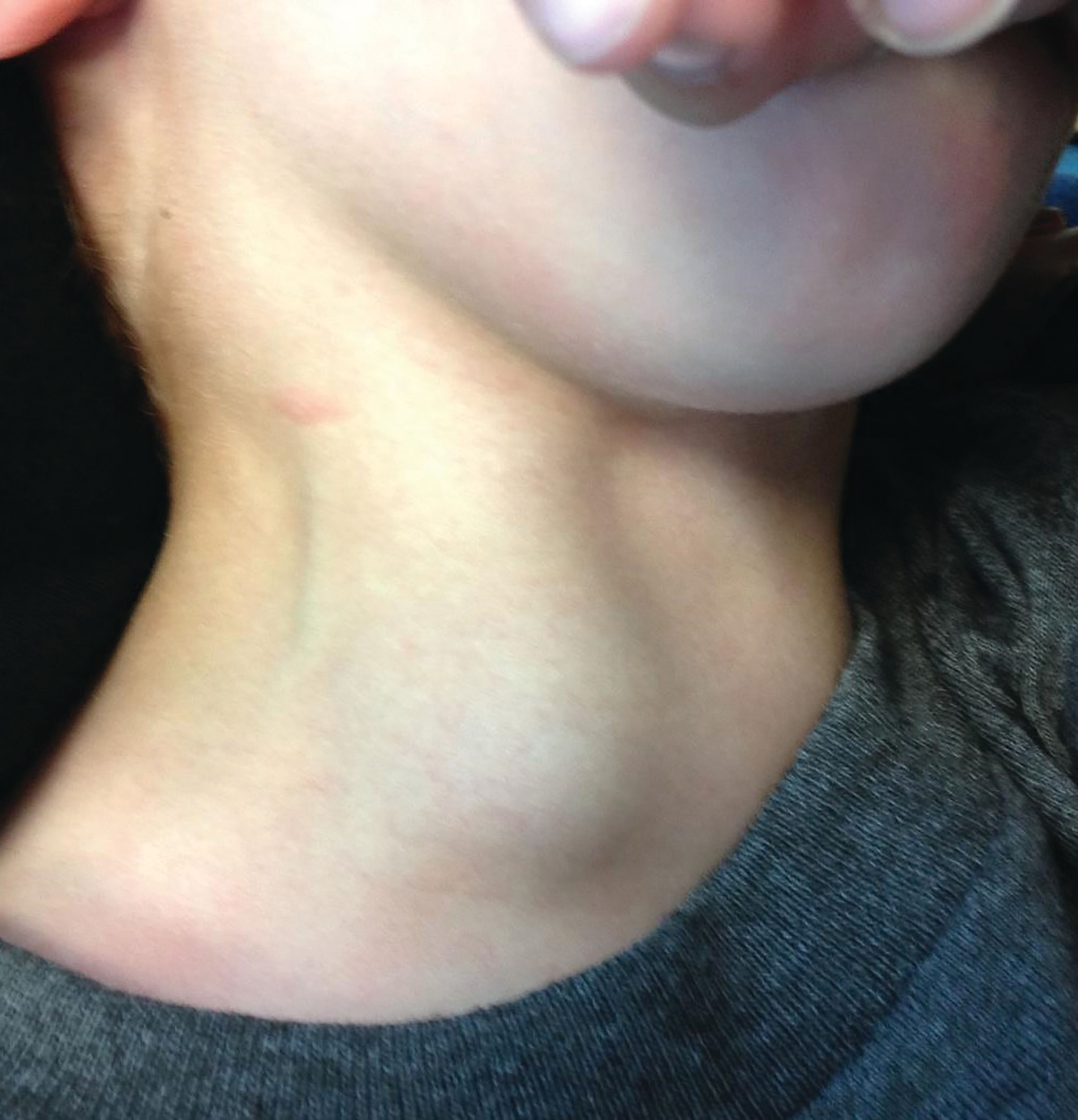 A 9-year-old boy was seen for follow-up of a neck mass noted several years earlier. He first presented with this finding at 3 years of age, when during an otherwise unremarkable examination, he became upset, and a protuberant swelling was noted in the anterior aspect of the right side of his neck. The mass was soft and presented as a bulge just above his right clavicle, and as quickly as it appeared, it disappeared as the child relaxed. At his initial presentation, the child had no history of head or neck trauma or any recent illnesses. He also had full range of motion of his neck, with no complaints of pain, nor was the area erythematous or tender to palpation. This swelling had not been observed at home before this time.