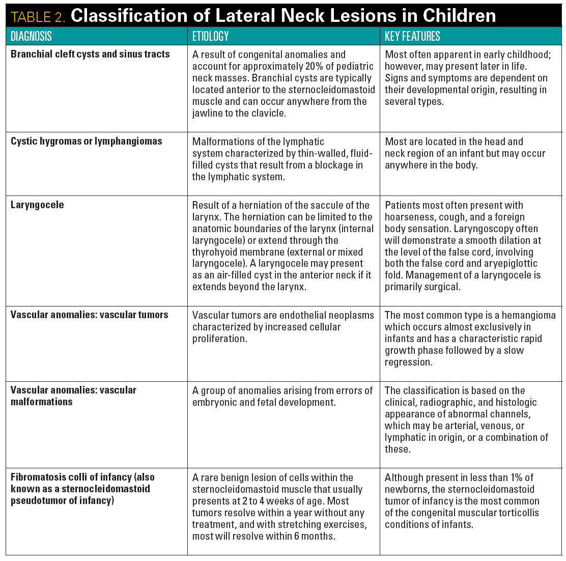 Neck masses in children1,2 are often categorized as developmental/congenital, inflammatory, infectious, or neoplastic in origin and may be further categorized by location and appearance of the mass as noted in Table 1.