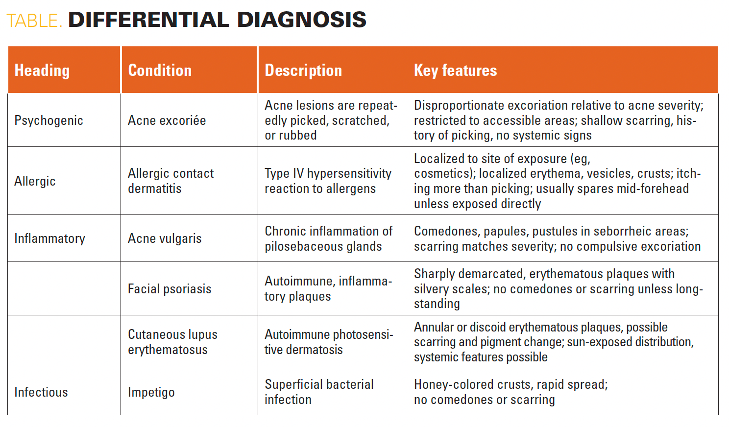 The differential diagnosis for excoriated or crusted facial lesions includes a wide range of psychogenic, allergic, inflammatory, and infectious conditions (Table). Acne excoriée, also known as excoriated acne, is a psychocutaneous disorder typically seen in adolescent girls, in which patients compulsively pick, scratch, or squeeze acne lesions. The result is often a pattern of excoriations, hyperpigmented macules, and shallow scars that are disproportionate to the underlying severity of the acne. Lesions are usually confined to accessible areas, such as the forehead, cheeks, and chin, while covered or hard-to-reach areas remain unaffected.7