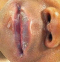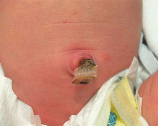 This neonate was brought to the emergency department because of erythema and periumbilical swelling. He had been feeding well and sleeping through the night.