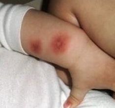 An 11-month-old boy presented with mild fever and rhinorrhea of several day’s duration. His mother had noted "insect bites" on his left leg and left foot swelling. The pediatrician found a well-appearing, interactive child in no acute distress. Several erythematous round, flat-topped papules, less than 0.5 cm in diameter, were noted on the left leg and torso. Moderate, non-pitting edema was noted over his left foot. A pale dusky discoloration developed in the foot over the next several hours and edema spread proximally to involve most of the left lower leg. The next day, additional lesions were noted on the left leg and trunk and the eruptions had spread to the patient’s arms, ears, face, and genitalia.