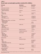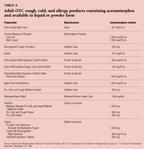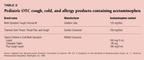 Acetaminophen was first marketed by McNeil Consumer Healthcare under the brand name of Tylenol. Other brand name products include Feverall, Panadol, and Tempra (Table 1); generics are available as well. A few cough, cold, and allergy products specifically marketed for children also contain acetaminophen (Table 2), as do many adult over-the-counter cough, cold, and allergy products. The following name brand products for adults contain acetaminophen: Clear Cough Night Time; Comtrex Maximum Strength Liqui-Gel and Night Liquid; Decongestant Cough Formula A; Genite; Vicks Dayquil Multi-Symptom Cold/Flu Relief, 44M Soothing Cough, Cold, and Flu Relief, NyQuil Multi-Symptom Cold/Flu Relief; Night Time Cold Medicine, Flu, Cold, and Cough Medicine; Robitussin Night Relief; TheraFlu Maximum Strength Flu, Cold, and Cough Medicine NightTime, Flu, Cold, and Cough, and Flu, Cold; Tylenol Flu NightTime Maximum Strength Hot Medication, Cough with Decongestant Multi-Symptom, and Cold Multi-Symptom. Table 3 lists preparations marketed for adults that are available in liquid or powder form and so could easily be administered to infants, toddlers, and children.