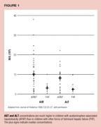 The parent may consult the pediatrician when, after multiple overdoses, the infant or child is nauseated, vomits, and becomes lethargic. Unfortunately, by the time these symptoms appear, significant liver injury may already have occurred, as indicated by markedly elevated serum liver enzymes (ALT, AST), prolonged prothrombin time, and elevated serum ammonia. Typically, the ALT and AST elevations reflect severe centrilobular necrosis. In one series, peak serum AST ranged from 1,180 to 30,000 IU/L and ALT ranged from 440 to more than 22,000 IU/L.7 As shown in Figure 1, peak serum AST and ALT values in infants and children with acetaminophen-induced liver injury are strikingly higher than peak AST and ALT in children who have fulminant hepatic failure from other causes.