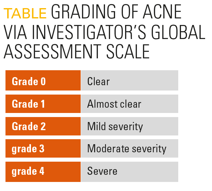 Acne can be comedonal, papulopustular, mixed, or nodular. In terms of severity, there are numerous different grading methods. It is crucial to recognize the type of acne because the clinical type and severity may affect treatment. The US Food and Drug Administration recommends grading acne via an Investigator’s Global Assessment scale (Table).