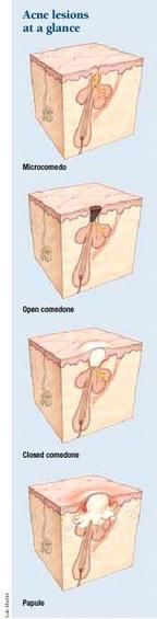 Another factor in the etiology of acne vulgaris is plugging of the pilosebaceous follicles. This plugging is related to disruption in the normal patterns of the epithelial cycle, with accumulation rather than desquamation of keratinized cells.1 The normal follicular duct becomes obstructed by the cell buildup and excess sebum, which form a horny plug. The first lesion to result clinically is the microcomedo, the precursor of all acne lesions. As the process continues, larger, noninflammatory lesions, comedones, develop. They may be open ("blackheads") or closed ("whiteheads"). The reason for the black appearance of open comedones is unclear, although compaction and oxidation of the keratinous material at the follicular orifice is one commonly accepted theory.