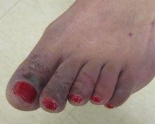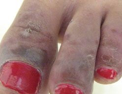The patient plays competitive soccer and had played 4 games in the cold rain before the rash appeared but said her feet hadn’t been injured. There were no other lesions on her legs or torso. The rash hadn’t developed in her family members and the family had not traveled recently.