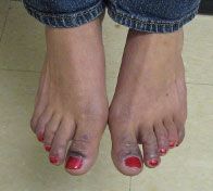 The patient’s toes appeared dusky in color and were cold to the touch. The purple skin at the base of the big toenails was not tender and there were no ulcerations or blisters. There were multiple erythematous, violaceous papules on both feet, primarily on the toes (Figures 2 and 3). The rest of her skin was clear. The patient refused a skin biopsy because it would interfere with her active soccer schedule.