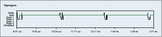 Figure 1 – This hypnogram from the patient's overnight polysomnogram shows that sleep latency was short and that sleep was entered into at the rapid eye movement (REM) stage. Sleep latency was 1 minute, which indicates pathological sleepiness. REM latency was 6 minutes and 30 seconds, which indicates almost sleep-onset REM.