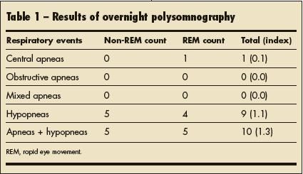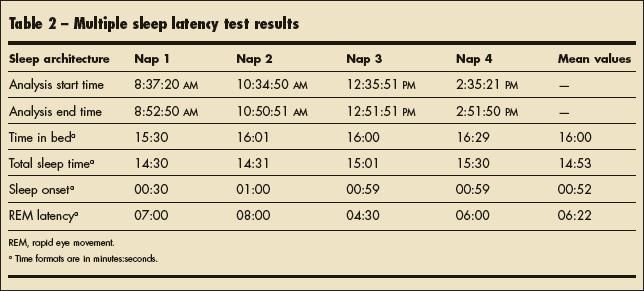 Results of office-based pulmonary function studies and a chest radiograph were normal. To investigate further, overnight polysomnography was performed the next evening followed by a multiple sleep latency test (MSLT). Human leukocyte antigen (HLA) typing for narcolepsy was also ordered. The polysomnogram indicated pathological sleepiness on the basis of the short amount of time that it took for the patient to lapse into rapid eye movement (REM) sleep (Figure 1, Table 1). The patient had 1 central apnea and 9 hypopneas; the apnea/ hypopnea index was 1.3 events per hour. This normal apnea/hypopnea index ruled out obstructive sleep apnea as the cause of his excessive daytime sleepiness.