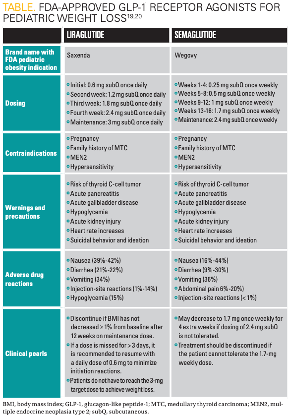 The FDA granted approval for the first GLP-1 RAs in April 2005 for blood glucose control in adult patients with type 2 diabetes.15 The medication class contains dulaglutide, exenatide, semaglutide, liraglutide, and lixisenatide. Of these, liraglutide and semaglutide are FDA approved for pediatric weight loss.16,17 In December 2020, liraglutide received approval as an adjunctive agent to lifestyle modifications for chronic weight management in pediatric patients 12 years and older with body weight greater than 60 kg and an initial BMI greater than 30 kg/m2 .17 In December 2022, the FDA approved semaglutide as an adjunctive agent to lifestyle modifications for chronic weight management in pediatric patients 12 years and older with an initial BMI equal to or greater than the 95th percentile standardized for age and sex.17 The clinical trial (STEP TEENS; NCT04102189) showed semaglutide was superior to placebo with a change in BMI percentage by week 68 at –16.1% with semaglutide vs +0.6% with placebo. Patients commonly experienced nausea, vomiting, diarrhea, headache, and abdominal pain during the study. Discontinuation of the trial regimen occurred in 5% in semaglutide group and 4% in the placebo group due most commonly to gastrointestinal events.16 Liraglutide (Saxenda) was evaluated in a placebo controlled 56 week long clinical trial with a resulting 2.65% reduction in body weight with liraglutide vs 2.37% increase in body weight with placebo. Gastrointestinal events were common and were the most common reason for regimen discontinuation at 10% in the liraglutide group and 0% in the placebo group.17 Of note, exenatide has been shown to significantly reduce BMI in adolescent patients with severe obesity compared with placebo; however, exenatide is not FDA approved for use in the pediatric population for this indication.18