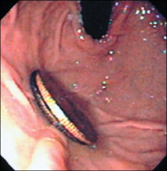 Usually no intervention is needed when an ingested rounded foreign body has reached the stomach, unless it is causing symptoms-as it did in our patient. In deciding how to treat in this setting, consider the patient's age; the type of object swallowed; and the presence of symptoms, such as difficulty in breathing or rash. For the asymptomatic child over 2 years old in whom the object has passed into the stomach, watchful waiting is appropriate.
