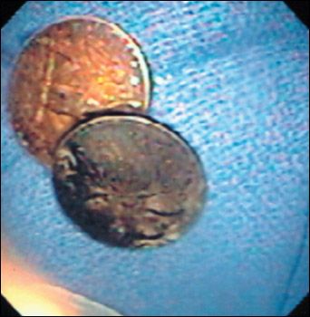 Based on a history of a similar rash in the periumbilical area after exposure to a nickel-containing jeans stud, and the lack of constitutional symptoms, it is most likely that this patient's rash is an allergic reaction to the nickel component of the coins he swallowed. The quarters were removed endoscopically (Figures 1and 2). One of the coins was a Canadian quarter, composed of 100% nickel without plating.1 The other was a US quarter, composed of a copper-nickel alloy.2 During endoscopy, it was noted that gastric mucosa in contact with the quarters had eroded. Therefore, a 1-week course of ranitidine was started.