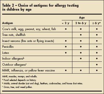 For children with urticaria or angioedema, allergy testing is left to the discretion of the clinician, because often the search for an allergic cause is not fruitful.19,20 A summary of skin test reagents for different ages is provided in Table 2.