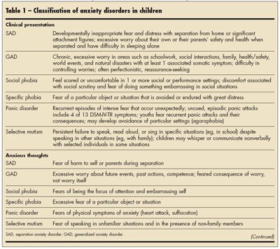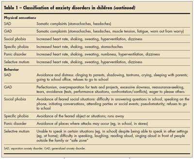 Understand symptoms of specific anxiety disorders.Table 1 reviews the clinical presentation for each anxiety disorder and considersthe anxious thoughts, physical sensations, and behavior related to children and adolescents.