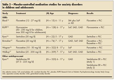 For moderate to severe anxiety, medication may be necessary. Medications can reduce the severity of anxiety symptoms so that the child can participate in CBT. Placebo-controlled trials have demonstrated short-term effectiveness of SSRIs for the treatment of childhood anxiety disorders (Table 2).12-18