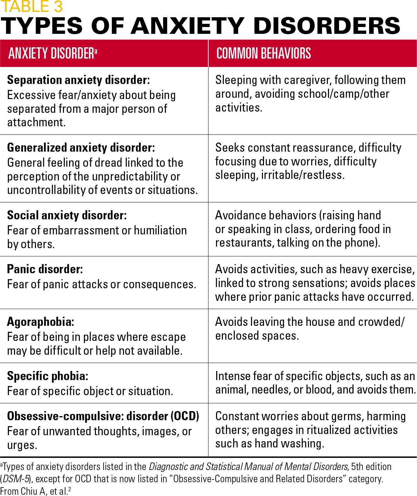 A particular challenge is differentiating an anxiety-related disorder from other childhood problems, such as major depressive disorder, bipolar disorder, oppositional mood dysregulation disorder, and attention-deficit/hyperactivity disorder (ADHD)-all of which can share similar symptoms of inattention, difficulty sleeping and eating, behavioral outbursts, social difficulties, and restlessness.2 Unlike these other childhood problems that are more pervasive across situations, one key distinguishing feature of an anxiety disorder is that it involves avoidance and distress that is more situational and triggered by a perceived threat. Identifying the source of the threat and the feared stimuli can help clinicians determine the type of anxiety disorder.2 (See Table 3 for types of anxiety disorders).