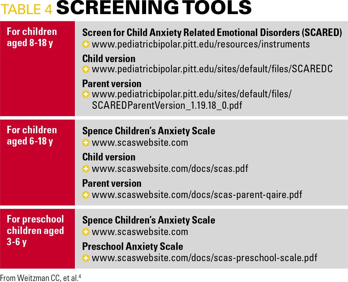 Once the clinical presentation suggests a child may have anxiety, a number of standardized tests are available to assess the type and severity. Table 4 lists screening tools for both parents and children that are easy and quick to complete.