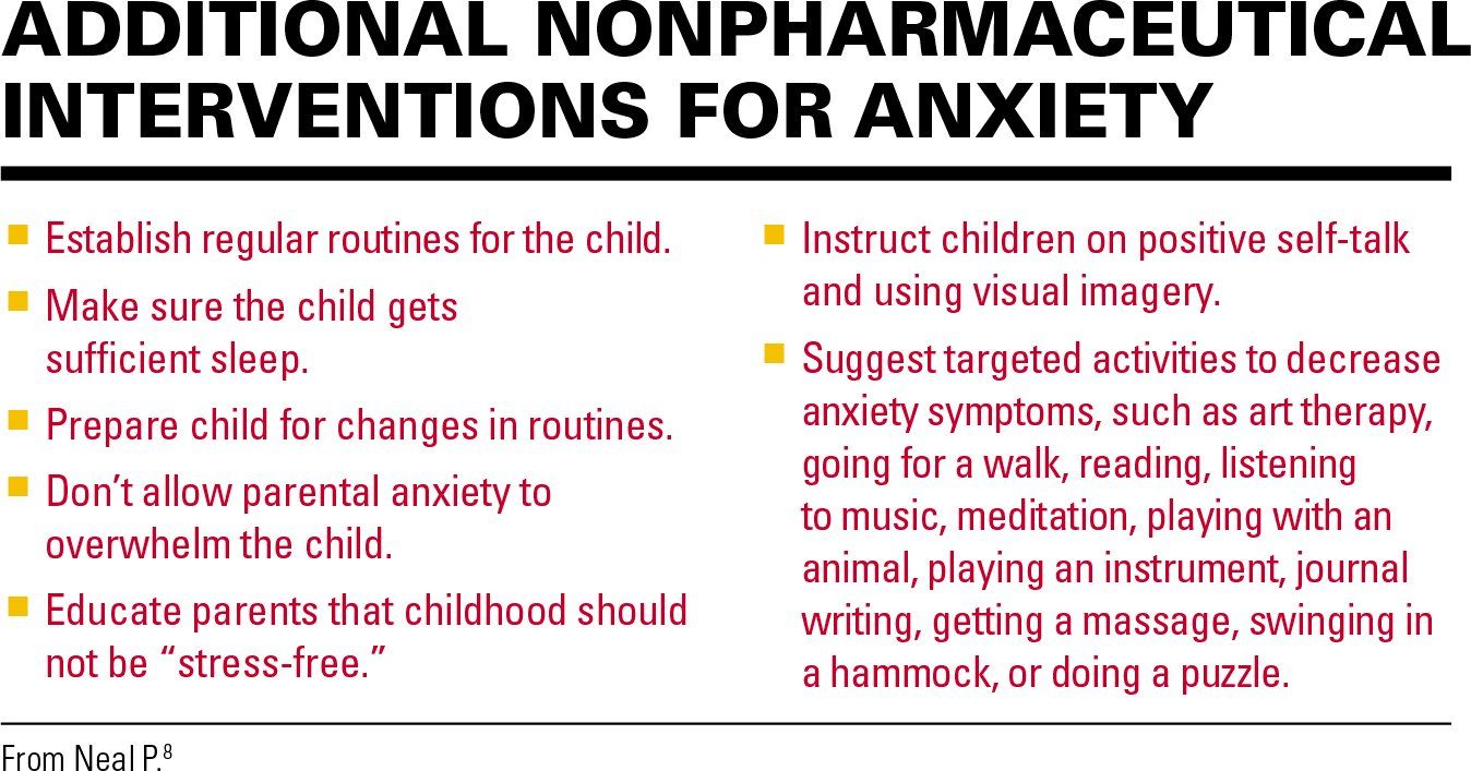 The goal of all treatment approaches is to reduce symptoms of anxiety and increase a child’s ability to cope with his/her anxiety without avoiding the feared object or situation.2 For children with milder forms of anxiety disorder, this goal may be accomplished by using nonpharmaceutical approaches such as cognitive behavioral therapy (CBT) and mindfulness-based therapies.1 Cognitive behavioral therapy is one of the most commonly used approaches and has shown efficacy for patients with several types of anxiety disorders.1,2,6,7 Key components of CBT include education of both the child and parents about the nature of anxiety; techniques for managing physical symptoms such as relaxation training and diaphragmatic breathing; reframing anxiety-provoking thoughts; as well as systematic exposure to feared stimuli or situations.1 (See “Additional nonpharmaceutical interventions for anxiety.”8)
