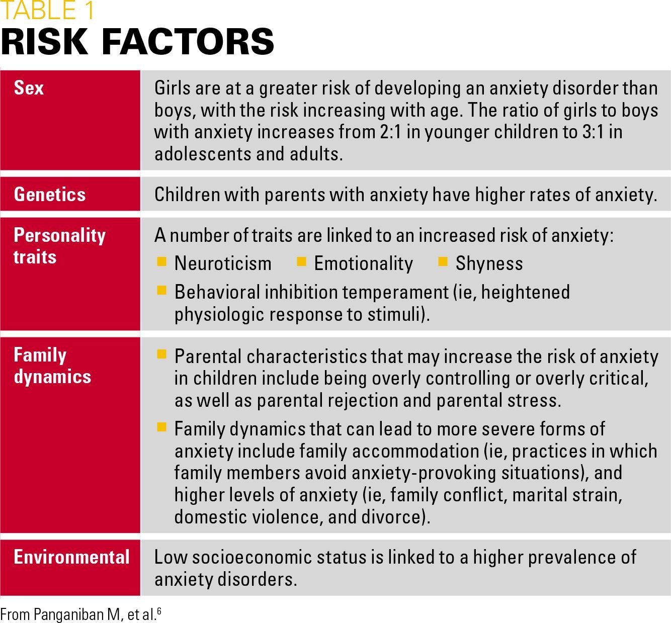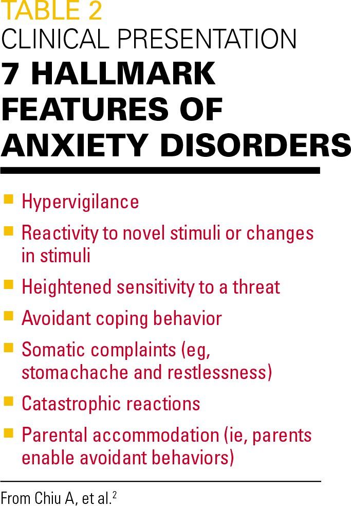 Differentiating an anxiety disorder from developmentally appropriate anxiety or other conditions that may mimic an anxiety disorder is challenging. To help make the differential diagnosis, recognizing the risk factors is important as well as knowing a number of hallmark features that present in adolescents with anxiety disorders (Tables 1 and 2). In addition, clinicians should be aware that children and parents/caregivers may describe anxiety-related symptoms in terms that misinterpret anxiety for something else (eg, parents may describe their child as sensitive, picky, or shy, or attribute symptoms of irritability, crying, or tantrums as signs of disobedience or oppositional behavior, while children may use words such as angry, upset, tense, or uncomfortable to describe their anxiety).2