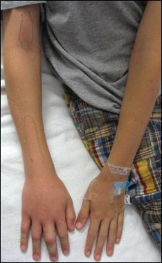 Four hours after a 12-year-old boy was stung by a honeybee on his right middle finger, he noticed localized hand swelling, erythema, and tenderness. The following morning, his entire hand was swollen and erythematous, with contiguous erythema on the medial aspect of his forearm and arm. Although the arm was tender to palpation, he was afebrile and felt well. Because of an initial concern for cellulitis or lymphangitis, he was given intravenous antibiotics and antihistamines and was admitted overnight for observation.