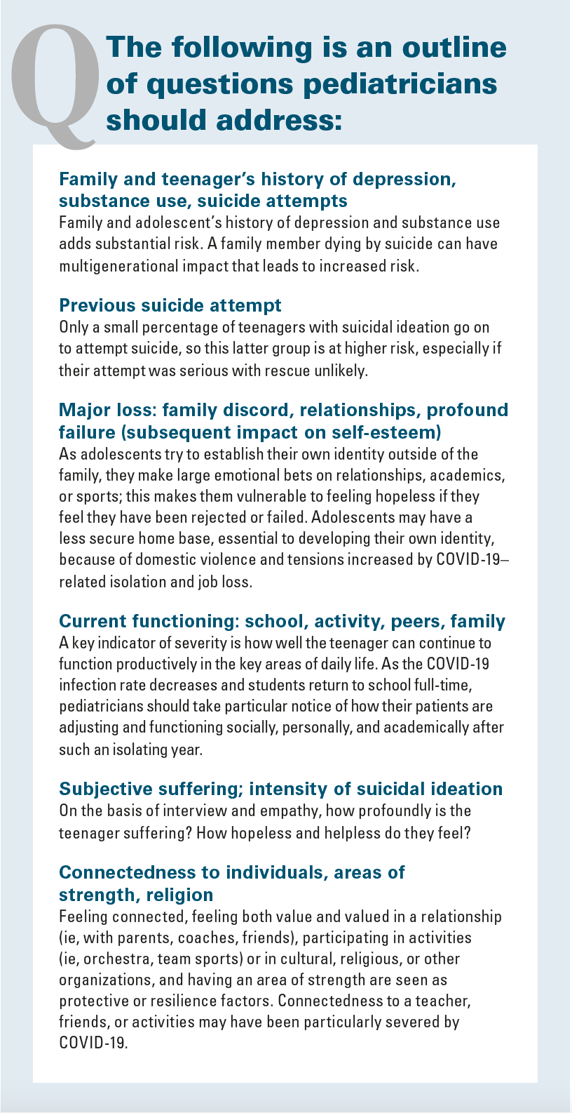 Pediatricians are understandably anxious given the rising rates (and the horror) of a teenager dying by suicide or a depressed teenager taking risks, such as drunk driving, that results in a death called an “accident.” The clinical dilemma arises from the rarity of these events and their lack of predictability. Preliminary research has suggested increased rates of youth suicide attempts during the pandemic compared with 2019,2 but it is still too soon to fully assess the impact of the pandemic on adolescent suicide rates.