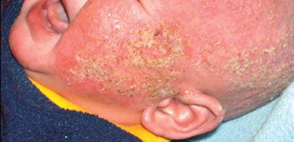 The rash on this 4-week-old girl had appeared 5 days earlier on her face as thickened scales on an erythematous base and subsequently spread to the scalp, shoulder, chest, abdomen, and extremities. A few bullae were noted on the neck and hands. Initial treatment with cephalexin failed to control the rash, and the infant was admitted to the hospital for further evaluation.