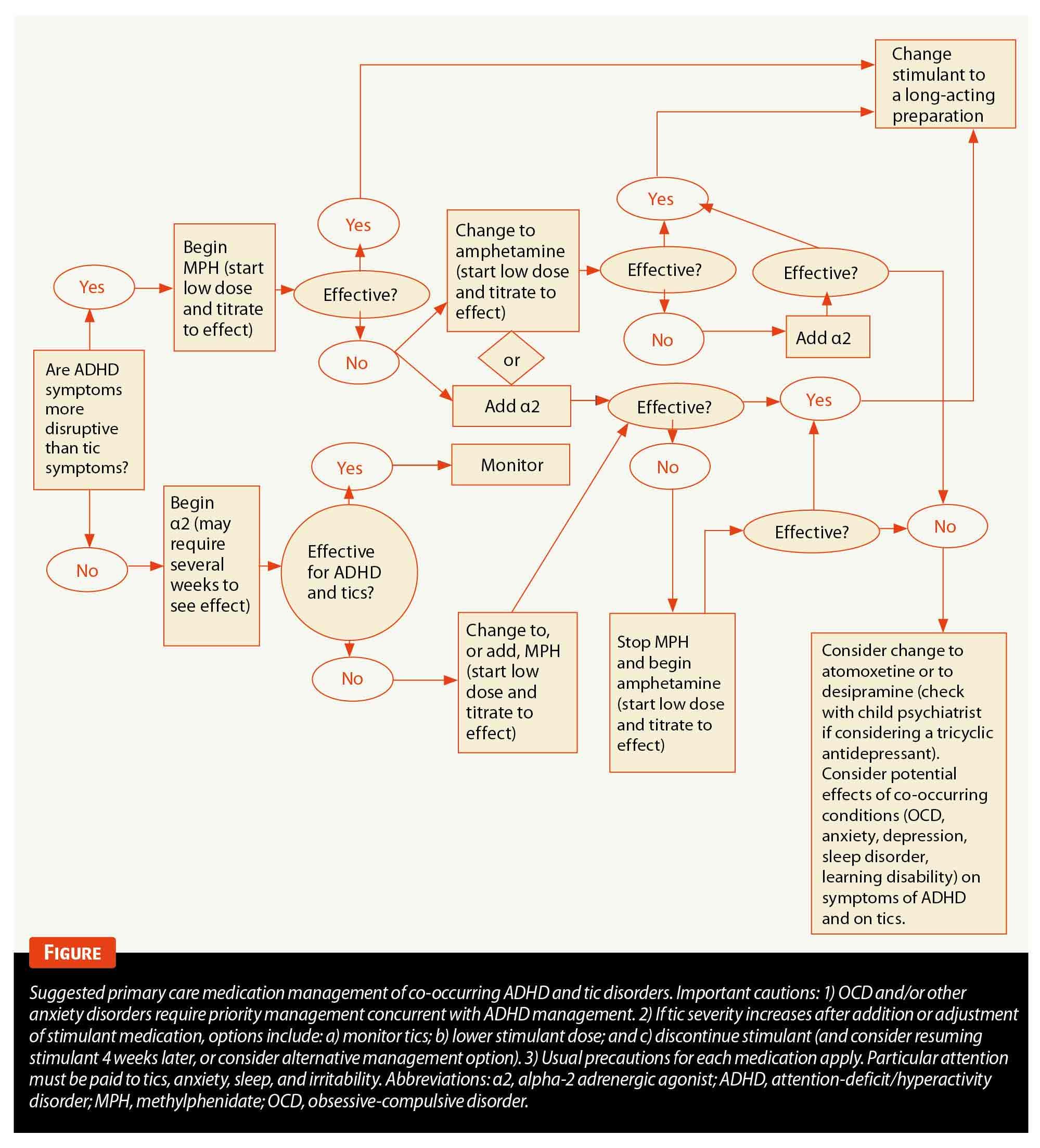 Desipramine also has undergone very limited investigation for this purpose but has been shown to be of possible benefit in treating both ADHD and tics.29 However, because use of desipramine poses risk of serious cardiac effect, including sudden death, desipramine is not first-line treatment, and consulting with a child psychiatrist and/or completing a full cardiac workup is indicated before initiating this medication (Figure; Table 3).5,30,31