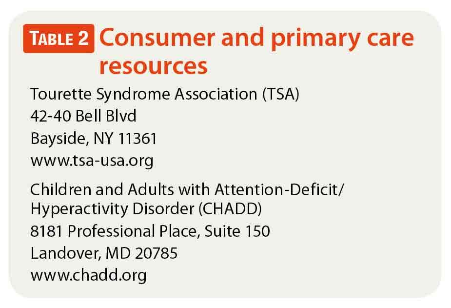 Providers can and should encourage families to contact regional chapters of national agencies that are invested in supporting families and health care providers in their shared efforts to learn about ADHD and about tic disorders. In particular, the Tourette Syndrome Association (www.tsa-usa.org) and Children and Adults with Attention-Deficit/Hyperactivity Disorder (www.chadd.org) provide evidence-based information on issues of self-advocacy, special education, and medical care (Table 2).
