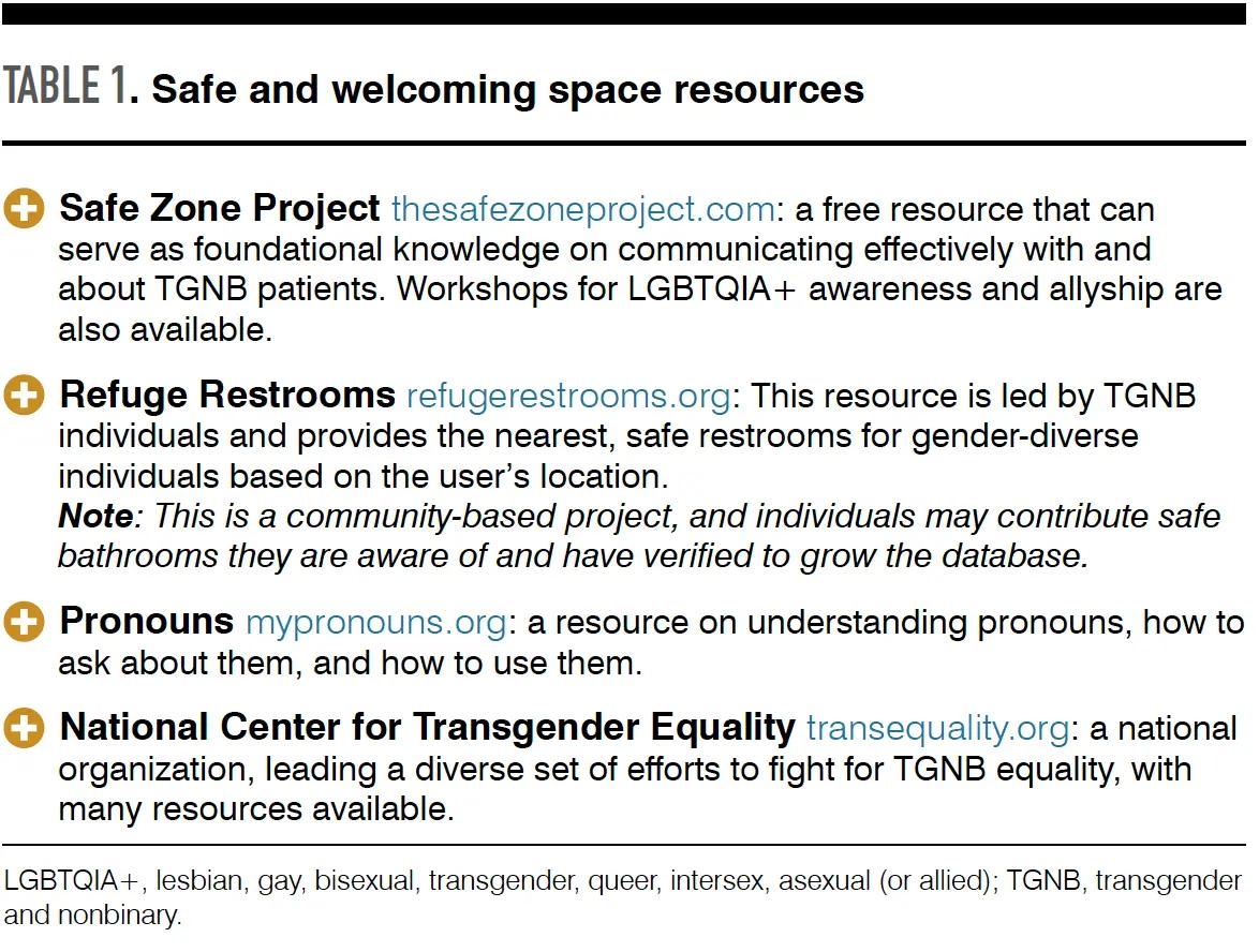 Patients must feel welcomed in clinical settings, and the care team should employ several things to establish inclusive spaces for gender-diverse patients (Table 1), including the following: