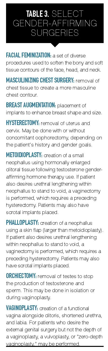 21. Grimstad F, Boskey ER, Taghinia A, Ganor O. Gender-affirming surgeries in transgender and gender diverse adolescent and young adults: a pediatric and adolescent gynecology primer. J Pediatr Adolesc Gynecol. 2021;34(4):442-448. doi:10.1016/j.jpag.2021.03.014
